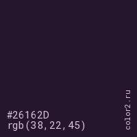 Цвет #26162D в цветовой модели RGB обозначается тремя октетами (38, 22, 45) в десятичном формате и #26162D в шестнадцатиричном (hex) формате, которые являются интенсивностью красного 38 (hex 26), интенсивность зелёного 22 (hex 16) и интенсивность синего 45 (hex 2D).