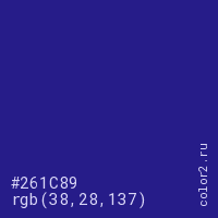 Цвет #261C89 в цветовой модели RGB обозначается тремя октетами (38, 28, 137) в десятичном формате и #261C89 в шестнадцатиричном (hex) формате, которые являются интенсивностью красного 38 (hex 26), интенсивность зелёного 28 (hex 1C) и интенсивность синего 137 (hex 89).