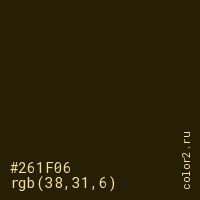 Цвет #261F06 в цветовой модели RGB обозначается тремя октетами (38, 31, 6) в десятичном формате и #261F06 в шестнадцатиричном (hex) формате, которые являются интенсивностью красного 38 (hex 26), интенсивность зелёного 31 (hex 1F) и интенсивность синего 6 (hex 06).