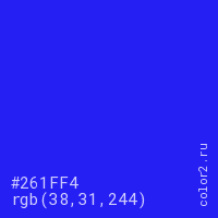 Цвет #261FF4 в цветовой модели RGB обозначается тремя октетами (38, 31, 244) в десятичном формате и #261FF4 в шестнадцатиричном (hex) формате, которые являются интенсивностью красного 38 (hex 26), интенсивность зелёного 31 (hex 1F) и интенсивность синего 244 (hex F4).