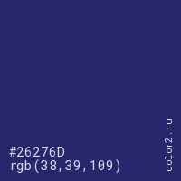 Цвет #26276D в цветовой модели RGB обозначается тремя октетами (38, 39, 109) в десятичном формате и #26276D в шестнадцатиричном (hex) формате, которые являются интенсивностью красного 38 (hex 26), интенсивность зелёного 39 (hex 27) и интенсивность синего 109 (hex 6D).
