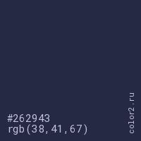 Цвет #262943 в цветовой модели RGB обозначается тремя октетами (38, 41, 67) в десятичном формате и #262943 в шестнадцатиричном (hex) формате, которые являются интенсивностью красного 38 (hex 26), интенсивность зелёного 41 (hex 29) и интенсивность синего 67 (hex 43).