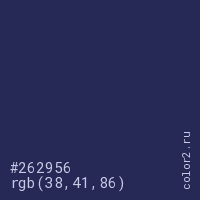 Цвет #262956 в цветовой модели RGB обозначается тремя октетами (38, 41, 86) в десятичном формате и #262956 в шестнадцатиричном (hex) формате, которые являются интенсивностью красного 38 (hex 26), интенсивность зелёного 41 (hex 29) и интенсивность синего 86 (hex 56).