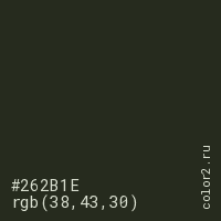 Цвет #262B1E в цветовой модели RGB обозначается тремя октетами (38, 43, 30) в десятичном формате и #262B1E в шестнадцатиричном (hex) формате, которые являются интенсивностью красного 38 (hex 26), интенсивность зелёного 43 (hex 2B) и интенсивность синего 30 (hex 1E).