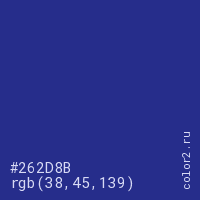 Цвет #262D8B в цветовой модели RGB обозначается тремя октетами (38, 45, 139) в десятичном формате и #262D8B в шестнадцатиричном (hex) формате, которые являются интенсивностью красного 38 (hex 26), интенсивность зелёного 45 (hex 2D) и интенсивность синего 139 (hex 8B).