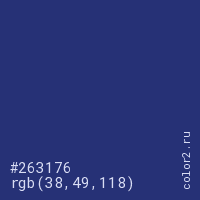 Цвет #263176 в цветовой модели RGB обозначается тремя октетами (38, 49, 118) в десятичном формате и #263176 в шестнадцатиричном (hex) формате, которые являются интенсивностью красного 38 (hex 26), интенсивность зелёного 49 (hex 31) и интенсивность синего 118 (hex 76).