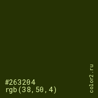 Цвет #263204 в цветовой модели RGB обозначается тремя октетами (38, 50, 4) в десятичном формате и #263204 в шестнадцатиричном (hex) формате, которые являются интенсивностью красного 38 (hex 26), интенсивность зелёного 50 (hex 32) и интенсивность синего 4 (hex 04).