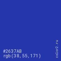 Цвет #2637AB в цветовой модели RGB обозначается тремя октетами (38, 55, 171) в десятичном формате и #2637AB в шестнадцатиричном (hex) формате, которые являются интенсивностью красного 38 (hex 26), интенсивность зелёного 55 (hex 37) и интенсивность синего 171 (hex AB).
