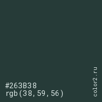 Цвет #263B38 в цветовой модели RGB обозначается тремя октетами (38, 59, 56) в десятичном формате и #263B38 в шестнадцатиричном (hex) формате, которые являются интенсивностью красного 38 (hex 26), интенсивность зелёного 59 (hex 3B) и интенсивность синего 56 (hex 38).