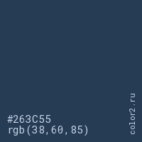 Цвет #263C55 в цветовой модели RGB обозначается тремя октетами (38, 60, 85) в десятичном формате и #263C55 в шестнадцатиричном (hex) формате, которые являются интенсивностью красного 38 (hex 26), интенсивность зелёного 60 (hex 3C) и интенсивность синего 85 (hex 55).