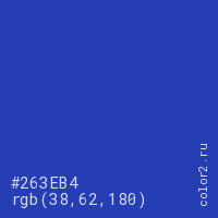 Цвет #263EB4 в цветовой модели RGB обозначается тремя октетами (38, 62, 180) в десятичном формате и #263EB4 в шестнадцатиричном (hex) формате, которые являются интенсивностью красного 38 (hex 26), интенсивность зелёного 62 (hex 3E) и интенсивность синего 180 (hex B4).