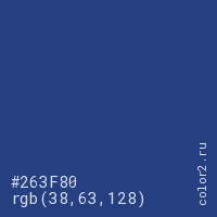 Цвет #263F80 в цветовой модели RGB обозначается тремя октетами (38, 63, 128) в десятичном формате и #263F80 в шестнадцатиричном (hex) формате, которые являются интенсивностью красного 38 (hex 26), интенсивность зелёного 63 (hex 3F) и интенсивность синего 128 (hex 80).