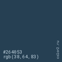 Цвет #264053 в цветовой модели RGB обозначается тремя октетами (38, 64, 83) в десятичном формате и #264053 в шестнадцатиричном (hex) формате, которые являются интенсивностью красного 38 (hex 26), интенсивность зелёного 64 (hex 40) и интенсивность синего 83 (hex 53).