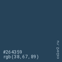 Цвет #264359 в цветовой модели RGB обозначается тремя октетами (38, 67, 89) в десятичном формате и #264359 в шестнадцатиричном (hex) формате, которые являются интенсивностью красного 38 (hex 26), интенсивность зелёного 67 (hex 43) и интенсивность синего 89 (hex 59).