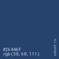 Цвет #26446F в цветовой модели RGB обозначается тремя октетами (38, 68, 111) в десятичном формате и #26446F в шестнадцатиричном (hex) формате, которые являются интенсивностью красного 38 (hex 26), интенсивность зелёного 68 (hex 44) и интенсивность синего 111 (hex 6F).