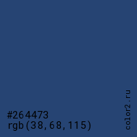 Цвет #264473 в цветовой модели RGB обозначается тремя октетами (38, 68, 115) в десятичном формате и #264473 в шестнадцатиричном (hex) формате, которые являются интенсивностью красного 38 (hex 26), интенсивность зелёного 68 (hex 44) и интенсивность синего 115 (hex 73).