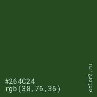 Цвет #264C24 в цветовой модели RGB обозначается тремя октетами (38, 76, 36) в десятичном формате и #264C24 в шестнадцатиричном (hex) формате, которые являются интенсивностью красного 38 (hex 26), интенсивность зелёного 76 (hex 4C) и интенсивность синего 36 (hex 24).