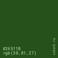 Цвет #26511B в цветовой модели RGB обозначается тремя октетами (38, 81, 27) в десятичном формате и #26511B в шестнадцатиричном (hex) формате, которые являются интенсивностью красного 38 (hex 26), интенсивность зелёного 81 (hex 51) и интенсивность синего 27 (hex 1B).