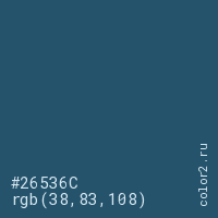 Цвет #26536C в цветовой модели RGB обозначается тремя октетами (38, 83, 108) в десятичном формате и #26536C в шестнадцатиричном (hex) формате, которые являются интенсивностью красного 38 (hex 26), интенсивность зелёного 83 (hex 53) и интенсивность синего 108 (hex 6C).