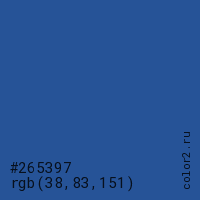 Цвет #265397 в цветовой модели RGB обозначается тремя октетами (38, 83, 151) в десятичном формате и #265397 в шестнадцатиричном (hex) формате, которые являются интенсивностью красного 38 (hex 26), интенсивность зелёного 83 (hex 53) и интенсивность синего 151 (hex 97).