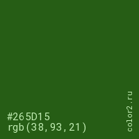 Цвет #265D15 в цветовой модели RGB обозначается тремя октетами (38, 93, 21) в десятичном формате и #265D15 в шестнадцатиричном (hex) формате, которые являются интенсивностью красного 38 (hex 26), интенсивность зелёного 93 (hex 5D) и интенсивность синего 21 (hex 15).