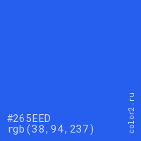 Цвет #265EED в цветовой модели RGB обозначается тремя октетами (38, 94, 237) в десятичном формате и #265EED в шестнадцатиричном (hex) формате, которые являются интенсивностью красного 38 (hex 26), интенсивность зелёного 94 (hex 5E) и интенсивность синего 237 (hex ED).