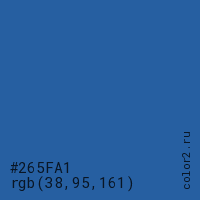 Цвет #265FA1 в цветовой модели RGB обозначается тремя октетами (38, 95, 161) в десятичном формате и #265FA1 в шестнадцатиричном (hex) формате, которые являются интенсивностью красного 38 (hex 26), интенсивность зелёного 95 (hex 5F) и интенсивность синего 161 (hex A1).