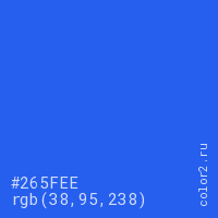 Цвет #265FEE в цветовой модели RGB обозначается тремя октетами (38, 95, 238) в десятичном формате и #265FEE в шестнадцатиричном (hex) формате, которые являются интенсивностью красного 38 (hex 26), интенсивность зелёного 95 (hex 5F) и интенсивность синего 238 (hex EE).