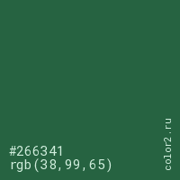 Цвет #266341 в цветовой модели RGB обозначается тремя октетами (38, 99, 65) в десятичном формате и #266341 в шестнадцатиричном (hex) формате, которые являются интенсивностью красного 38 (hex 26), интенсивность зелёного 99 (hex 63) и интенсивность синего 65 (hex 41).