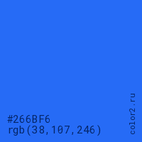 Цвет #266BF6 в цветовой модели RGB обозначается тремя октетами (38, 107, 246) в десятичном формате и #266BF6 в шестнадцатиричном (hex) формате, которые являются интенсивностью красного 38 (hex 26), интенсивность зелёного 107 (hex 6B) и интенсивность синего 246 (hex F6).