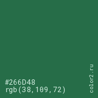 Цвет #266D48 в цветовой модели RGB обозначается тремя октетами (38, 109, 72) в десятичном формате и #266D48 в шестнадцатиричном (hex) формате, которые являются интенсивностью красного 38 (hex 26), интенсивность зелёного 109 (hex 6D) и интенсивность синего 72 (hex 48).