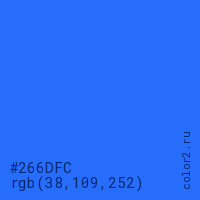 Цвет #266DFC в цветовой модели RGB обозначается тремя октетами (38, 109, 252) в десятичном формате и #266DFC в шестнадцатиричном (hex) формате, которые являются интенсивностью красного 38 (hex 26), интенсивность зелёного 109 (hex 6D) и интенсивность синего 252 (hex FC).