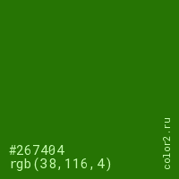 Цвет #267404 в цветовой модели RGB обозначается тремя октетами (38, 116, 4) в десятичном формате и #267404 в шестнадцатиричном (hex) формате, которые являются интенсивностью красного 38 (hex 26), интенсивность зелёного 116 (hex 74) и интенсивность синего 4 (hex 04).
