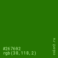 Цвет #267602 в цветовой модели RGB обозначается тремя октетами (38, 118, 2) в десятичном формате и #267602 в шестнадцатиричном (hex) формате, которые являются интенсивностью красного 38 (hex 26), интенсивность зелёного 118 (hex 76) и интенсивность синего 2 (hex 02).