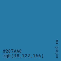 Цвет #267AA6 в цветовой модели RGB обозначается тремя октетами (38, 122, 166) в десятичном формате и #267AA6 в шестнадцатиричном (hex) формате, которые являются интенсивностью красного 38 (hex 26), интенсивность зелёного 122 (hex 7A) и интенсивность синего 166 (hex A6).