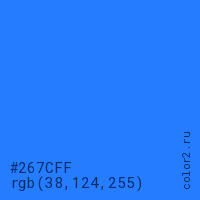 Цвет #267CFF в цветовой модели RGB обозначается тремя октетами (38, 124, 255) в десятичном формате и #267CFF в шестнадцатиричном (hex) формате, которые являются интенсивностью красного 38 (hex 26), интенсивность зелёного 124 (hex 7C) и интенсивность синего 255 (hex FF).