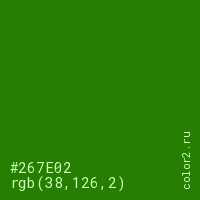Цвет #267E02 в цветовой модели RGB обозначается тремя октетами (38, 126, 2) в десятичном формате и #267E02 в шестнадцатиричном (hex) формате, которые являются интенсивностью красного 38 (hex 26), интенсивность зелёного 126 (hex 7E) и интенсивность синего 2 (hex 02).