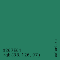 Цвет #267E61 в цветовой модели RGB обозначается тремя октетами (38, 126, 97) в десятичном формате и #267E61 в шестнадцатиричном (hex) формате, которые являются интенсивностью красного 38 (hex 26), интенсивность зелёного 126 (hex 7E) и интенсивность синего 97 (hex 61).