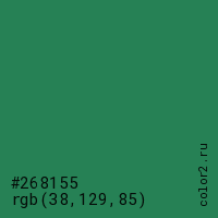 Цвет #268155 в цветовой модели RGB обозначается тремя октетами (38, 129, 85) в десятичном формате и #268155 в шестнадцатиричном (hex) формате, которые являются интенсивностью красного 38 (hex 26), интенсивность зелёного 129 (hex 81) и интенсивность синего 85 (hex 55).