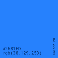 Цвет #2681FD в цветовой модели RGB обозначается тремя октетами (38, 129, 253) в десятичном формате и #2681FD в шестнадцатиричном (hex) формате, которые являются интенсивностью красного 38 (hex 26), интенсивность зелёного 129 (hex 81) и интенсивность синего 253 (hex FD).