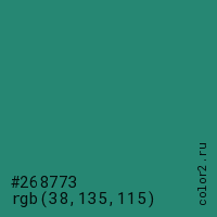 Цвет #268773 в цветовой модели RGB обозначается тремя октетами (38, 135, 115) в десятичном формате и #268773 в шестнадцатиричном (hex) формате, которые являются интенсивностью красного 38 (hex 26), интенсивность зелёного 135 (hex 87) и интенсивность синего 115 (hex 73).