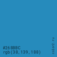 Цвет #268BBC в цветовой модели RGB обозначается тремя октетами (38, 139, 188) в десятичном формате и #268BBC в шестнадцатиричном (hex) формате, которые являются интенсивностью красного 38 (hex 26), интенсивность зелёного 139 (hex 8B) и интенсивность синего 188 (hex BC).