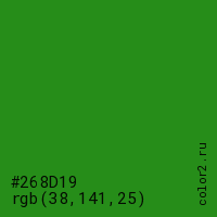 Цвет #268D19 в цветовой модели RGB обозначается тремя октетами (38, 141, 25) в десятичном формате и #268D19 в шестнадцатиричном (hex) формате, которые являются интенсивностью красного 38 (hex 26), интенсивность зелёного 141 (hex 8D) и интенсивность синего 25 (hex 19).