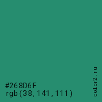 Цвет #268D6F в цветовой модели RGB обозначается тремя октетами (38, 141, 111) в десятичном формате и #268D6F в шестнадцатиричном (hex) формате, которые являются интенсивностью красного 38 (hex 26), интенсивность зелёного 141 (hex 8D) и интенсивность синего 111 (hex 6F).