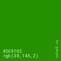 Цвет #269102 в цветовой модели RGB обозначается тремя октетами (38, 145, 2) в десятичном формате и #269102 в шестнадцатиричном (hex) формате, которые являются интенсивностью красного 38 (hex 26), интенсивность зелёного 145 (hex 91) и интенсивность синего 2 (hex 02).