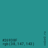Цвет #26938F в цветовой модели RGB обозначается тремя октетами (38, 147, 143) в десятичном формате и #26938F в шестнадцатиричном (hex) формате, которые являются интенсивностью красного 38 (hex 26), интенсивность зелёного 147 (hex 93) и интенсивность синего 143 (hex 8F).
