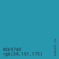 Цвет #2697AD в цветовой модели RGB обозначается тремя октетами (38, 151, 173) в десятичном формате и #2697AD в шестнадцатиричном (hex) формате, которые являются интенсивностью красного 38 (hex 26), интенсивность зелёного 151 (hex 97) и интенсивность синего 173 (hex AD).