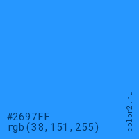 Цвет #2697FF в цветовой модели RGB обозначается тремя октетами (38, 151, 255) в десятичном формате и #2697FF в шестнадцатиричном (hex) формате, которые являются интенсивностью красного 38 (hex 26), интенсивность зелёного 151 (hex 97) и интенсивность синего 255 (hex FF).