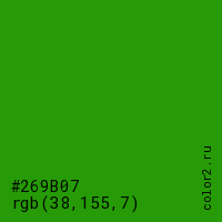 Цвет #269B07 в цветовой модели RGB обозначается тремя октетами (38, 155, 7) в десятичном формате и #269B07 в шестнадцатиричном (hex) формате, которые являются интенсивностью красного 38 (hex 26), интенсивность зелёного 155 (hex 9B) и интенсивность синего 7 (hex 07).