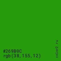 Цвет #269B0C в цветовой модели RGB обозначается тремя октетами (38, 155, 12) в десятичном формате и #269B0C в шестнадцатиричном (hex) формате, которые являются интенсивностью красного 38 (hex 26), интенсивность зелёного 155 (hex 9B) и интенсивность синего 12 (hex 0C).